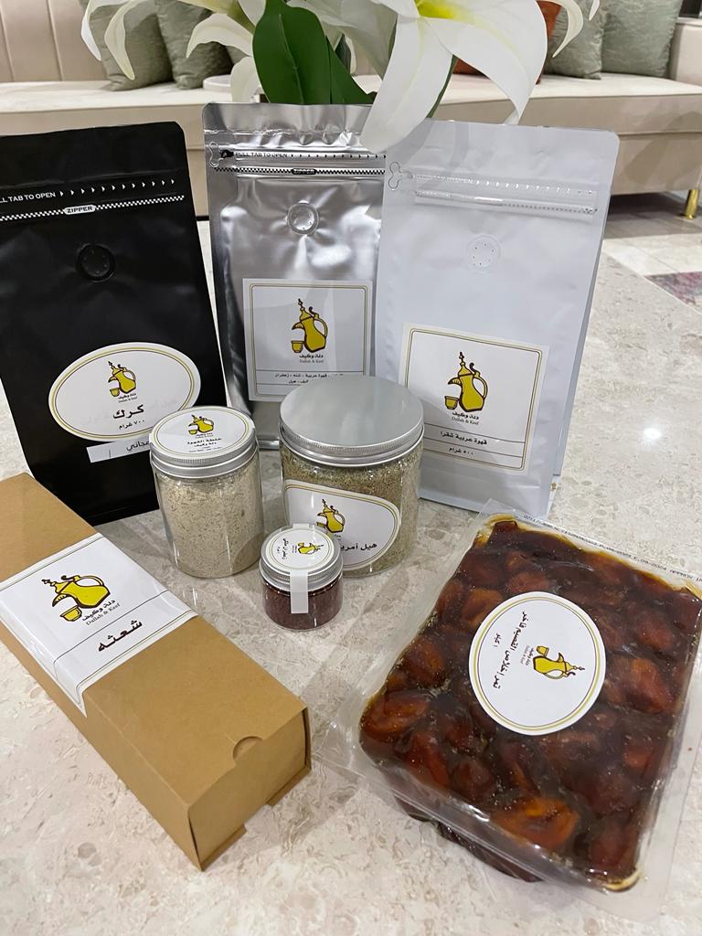 يتكون من : عدد 2 قهوه محوجه 500 غرام , عدد 1 كرك وزن 700 غرام , عدد 1 هيل امريكي وزن 250 غرام , عدد 1 خلطة دلة وكيف وزن 150 غرام , عدد 1 تمر اخلاص درجة اولى وزن 1 كيلو , عدد 1 شعثه الوزن 500 غرام
