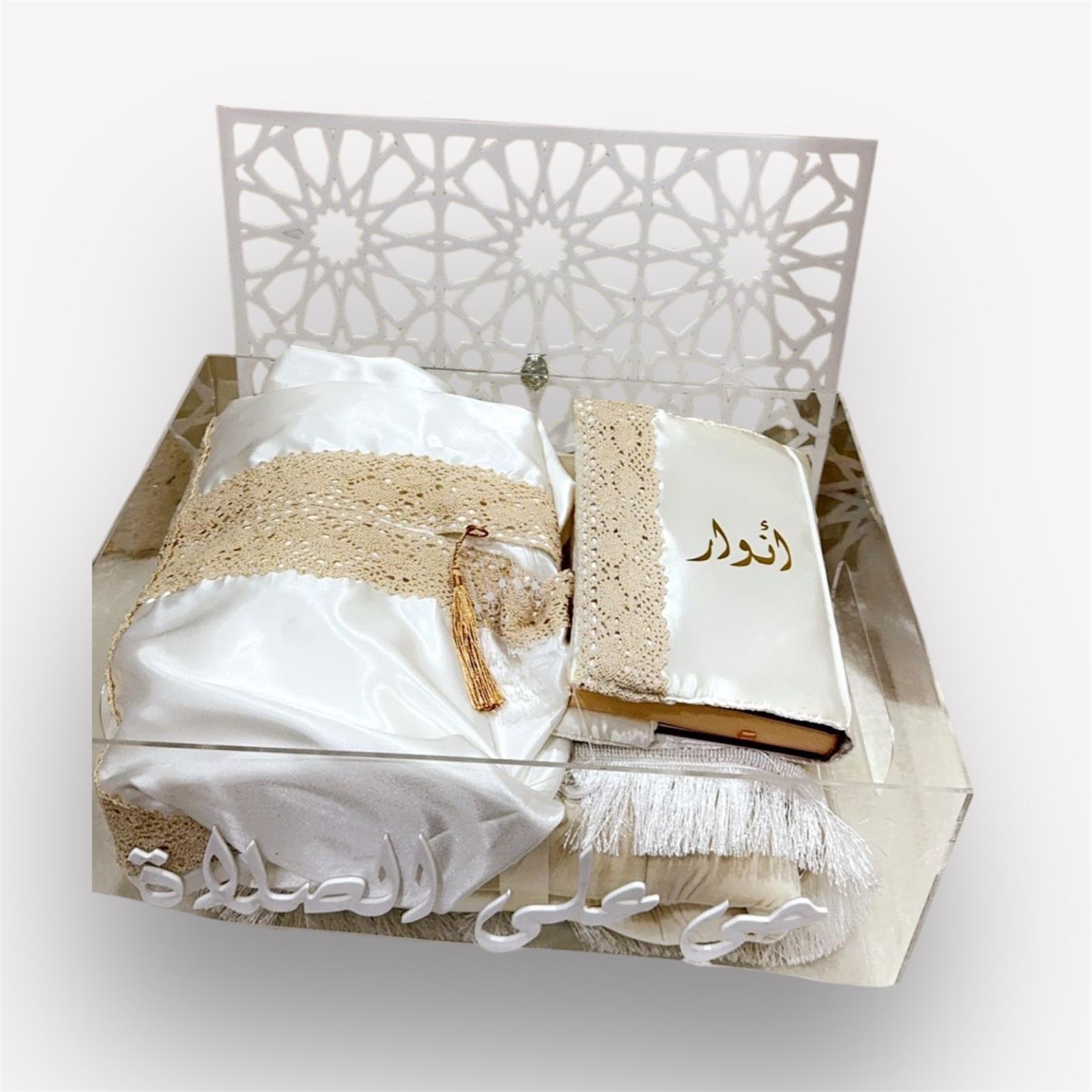 الطقم يتكون من سجاده اسفنج وثوب الصلاة المقاس فري سايس ومصحف مع تلبيسه وفاصل قران