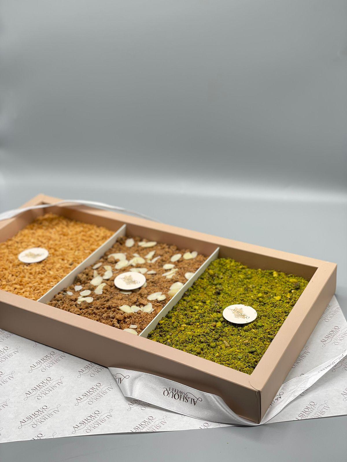 يتكون من ٣ انواع تشيز تمر وكوكيز و بستاشيو