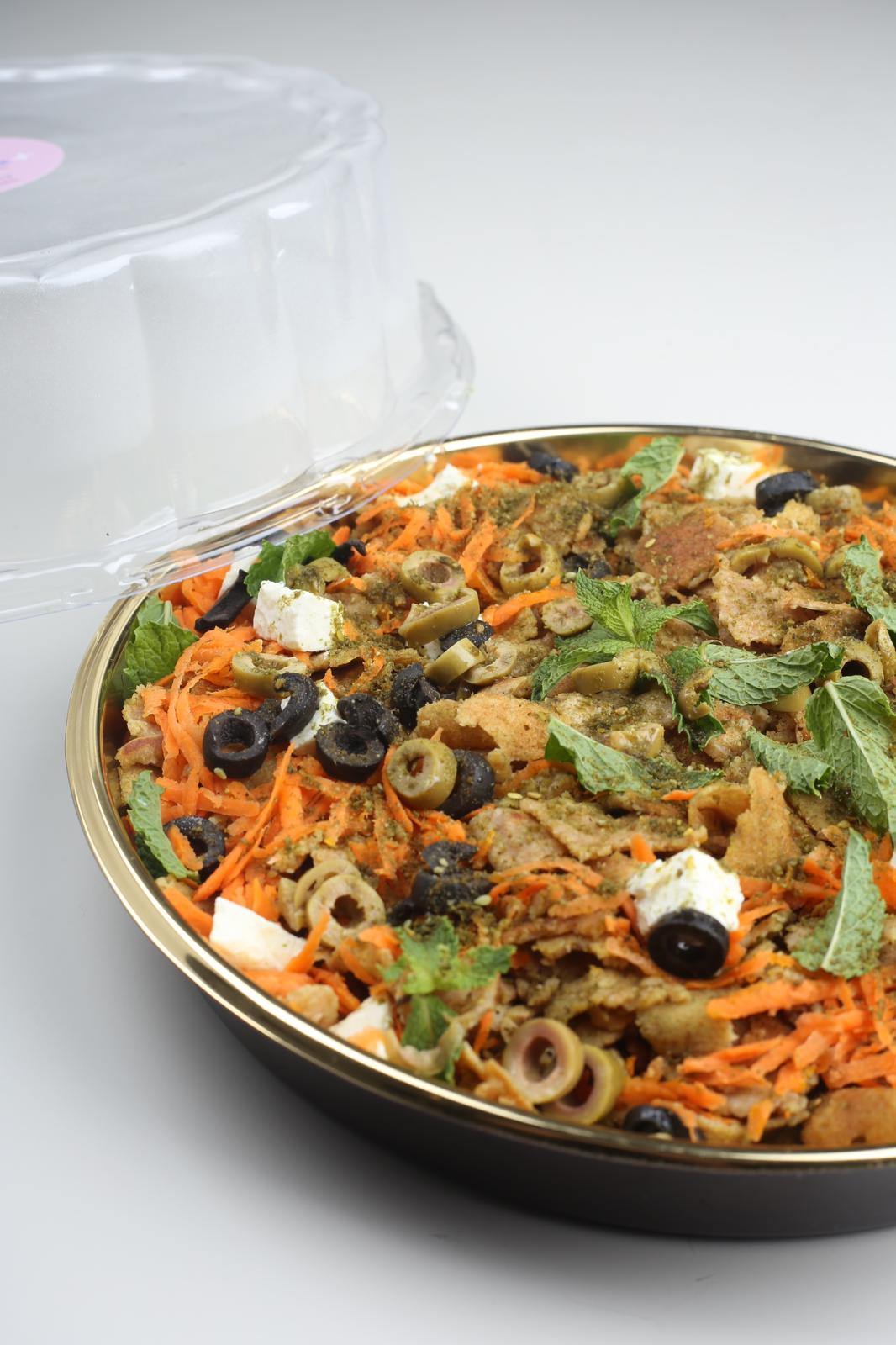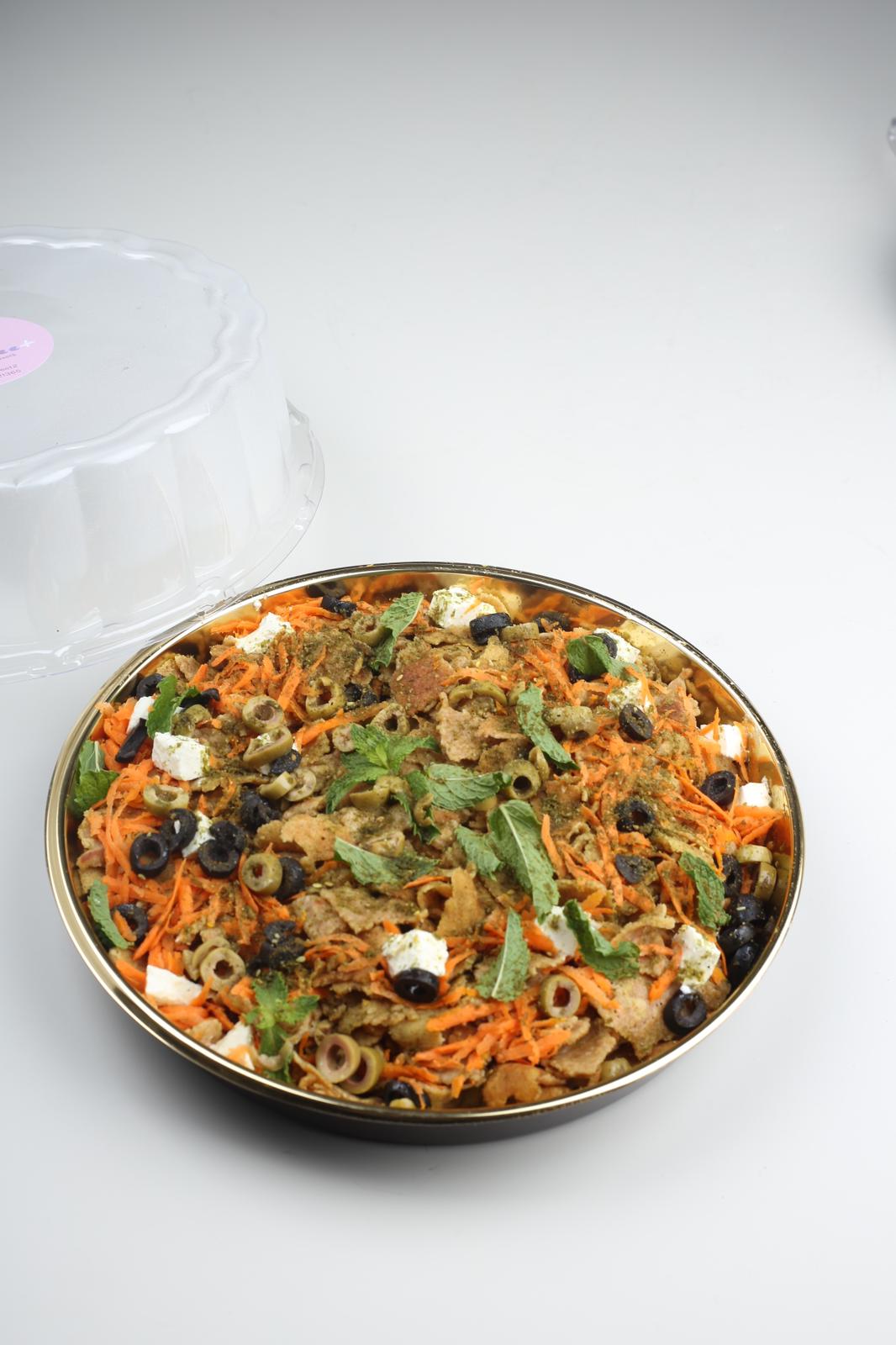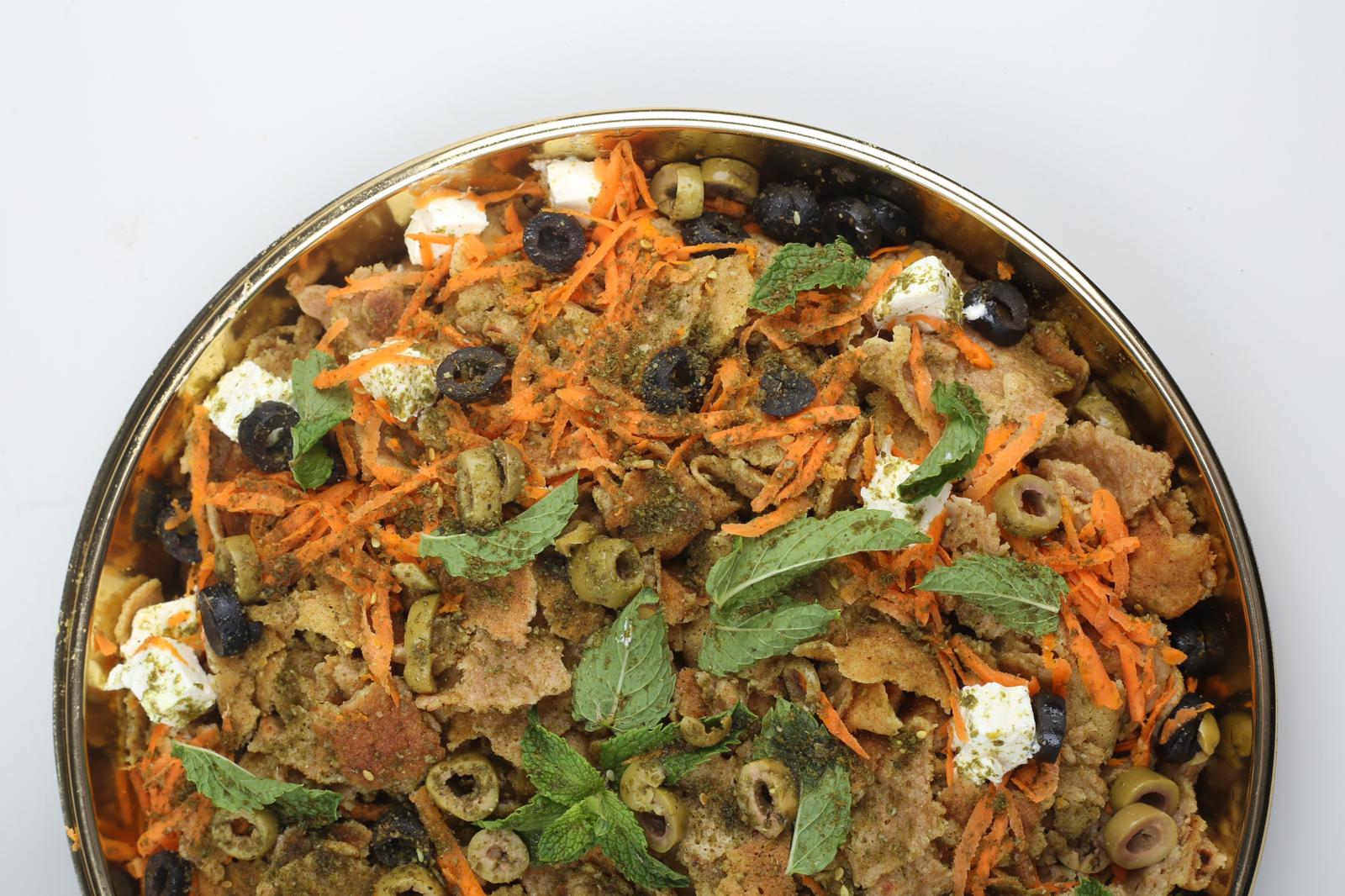 الخبز المقطع الممزوج بالزبده والزعتر ومضاف علية جبن الماعز وقطع الزيتون والجزر