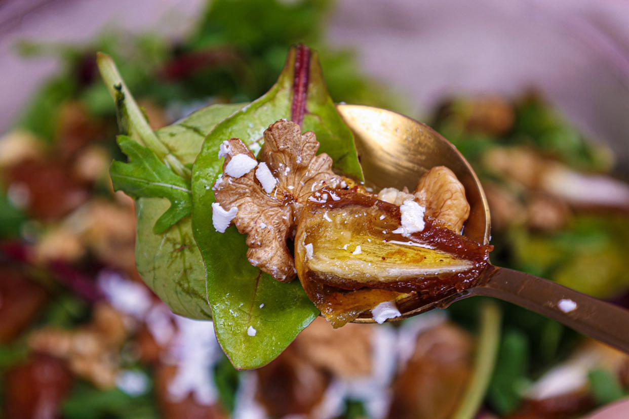 تتكون من الخس الروماني مع الجوز وجبن الفيتا وشرائح التمر