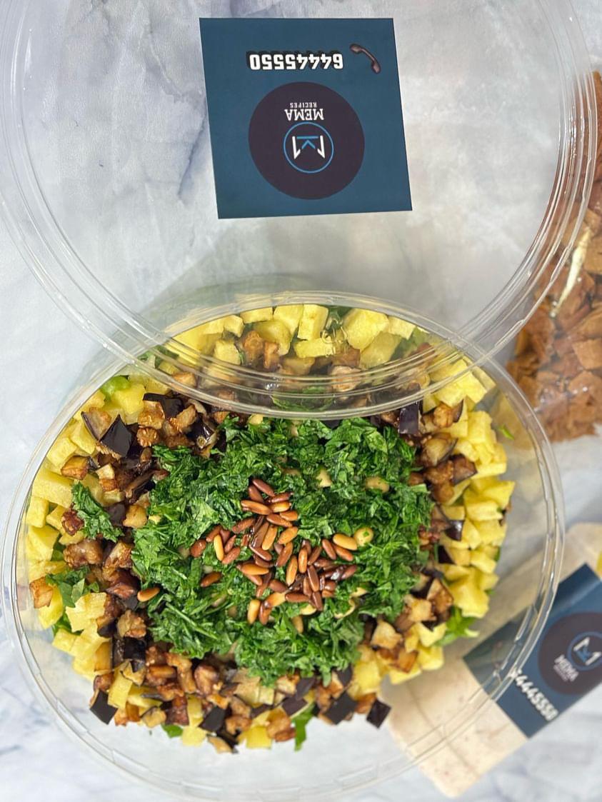 المكونات خس بقدونس بطاط وباذنجان مقلي مع النخي والصنوبر تكفي من 5-6 اشخاص