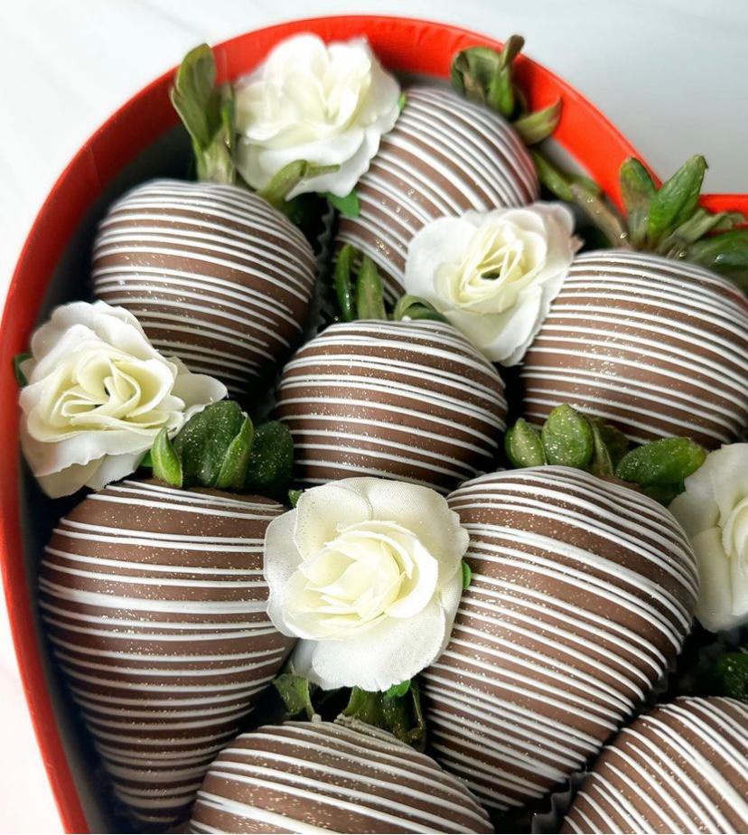 فراولة مع شوكولاته بلجيكية تتكون من 10 حبات فرواله مع 9 حبات ورد بيبي جوري من اختياركم اللون المفضل لديكم
