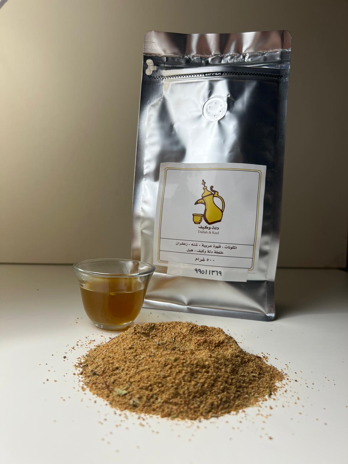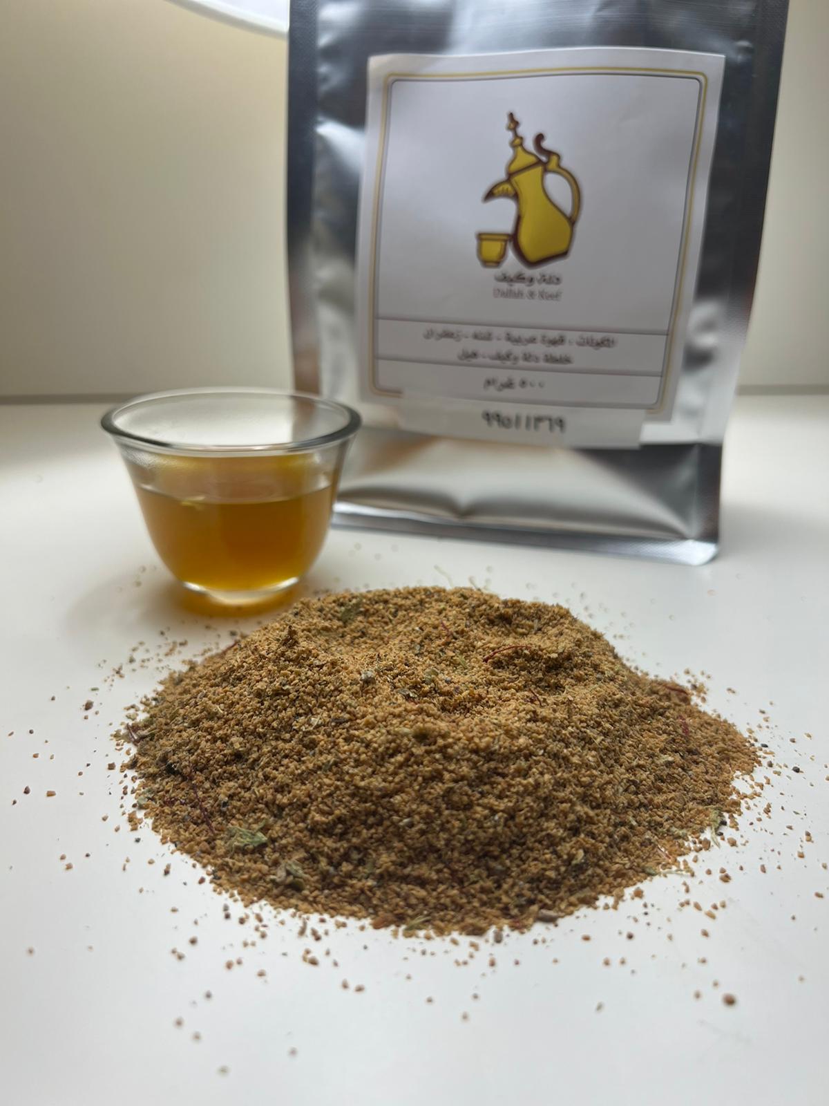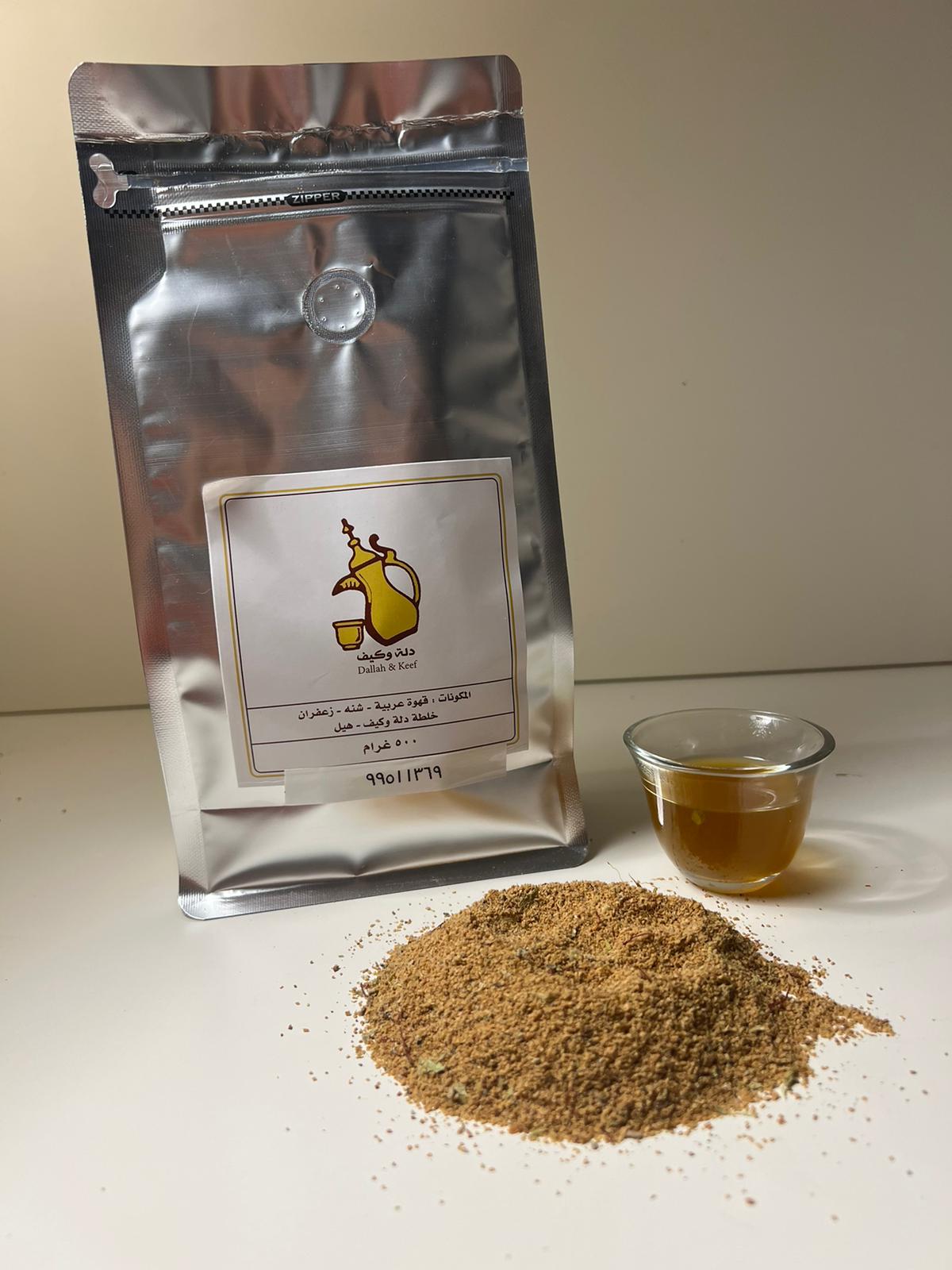 المكونات : قهوه عربية , شنه , زعفران , خلطة دله وكيف , هيل