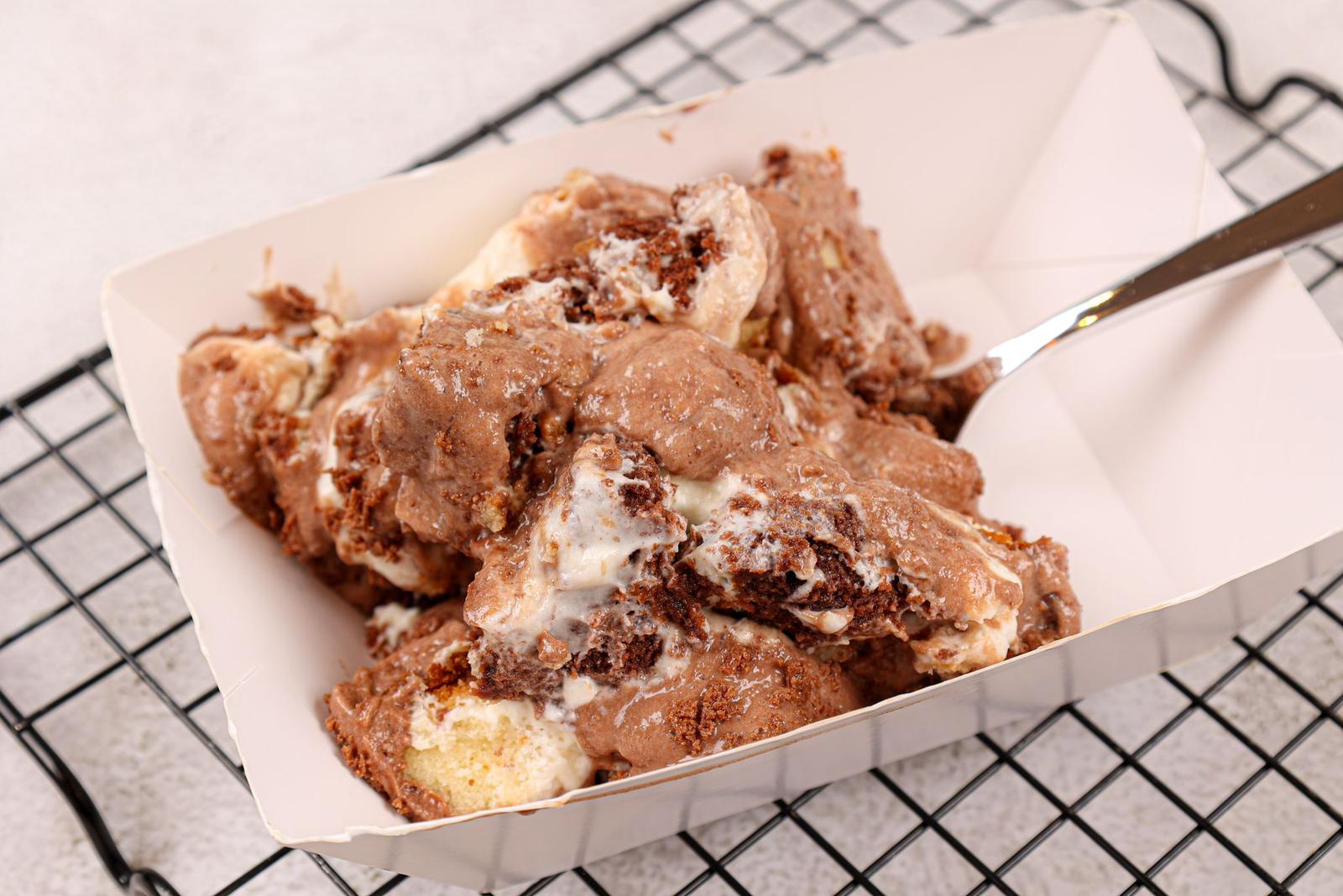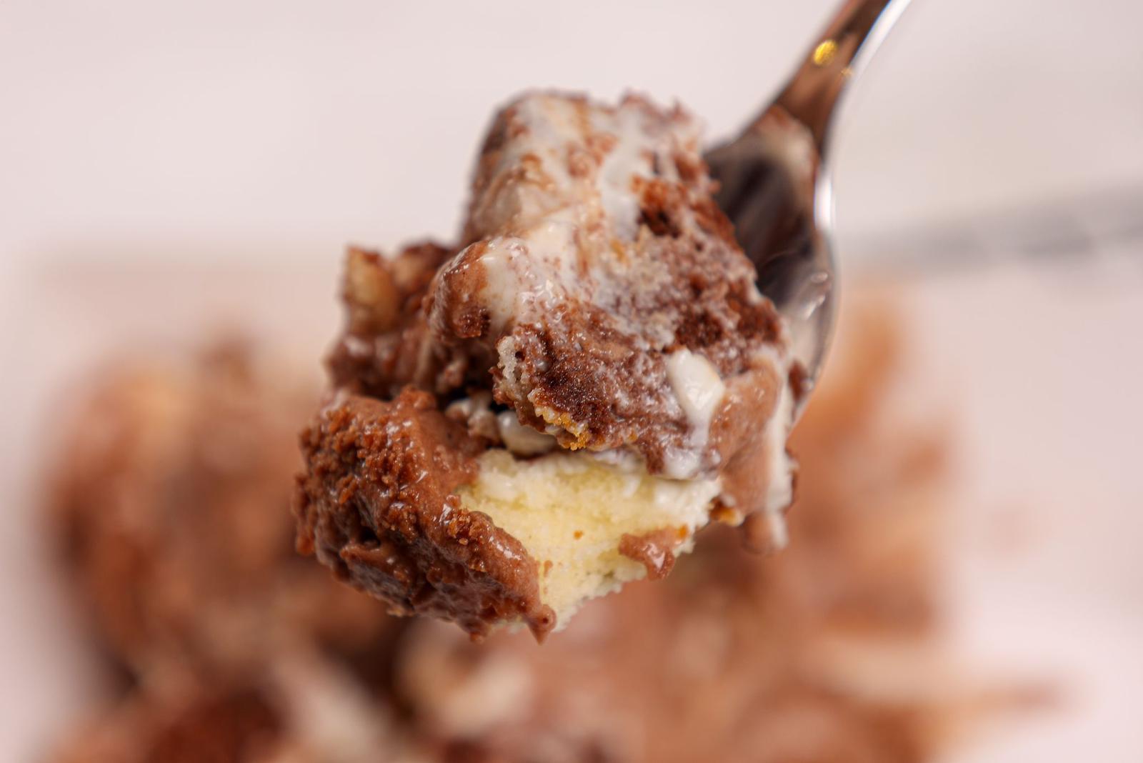 مزيج من صلصة الكريمة البيضاء مع كعكة الشوكولاتة وصلصة الشوكولاتة مع كعكة الفانيليا، طعم ونكهة سلسة وغنية